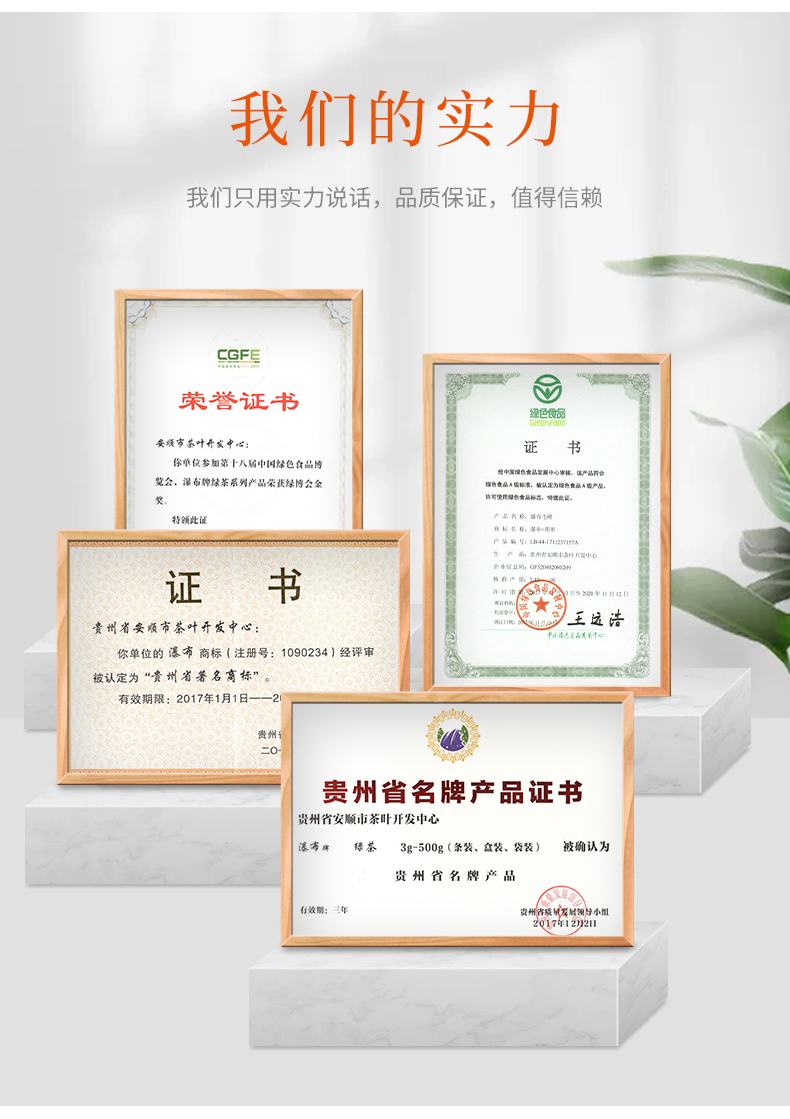 瀑布茶品牌是安順市人民政府主打茶葉品牌,省級重點打造區域公共品牌,屬貴州五大名茶,先后獲得獲“中國農產品區域公用品牌”、“貴州省著名商標”“貴州省名牌產品”等榮譽稱號近年來,在各級部門大力推動下,瀑布茶品牌不斷發展壯大。截止目前,現有瀑布茶品牌加盟企業23家,輻射茶園面積200000余畝其中綠色食品認證茶園基地面積7000余畝,有機食品認證基地面積2500畝擁有“瀑布毛峰”、“瀑布翠芽”“瀑布紅茶”、“瀑布翠龍”等產品,多次獲得“中綠杯”、“中茶杯”、“華茗杯”大獎;分別榮獲14屆中國國際農產品交易會金獎18屆中國綠色食品博覽會金獎“黃山杯”首屆全國傳統名茶產品質量特別金獎、安順十大旅游商品等殊榮及稱號。