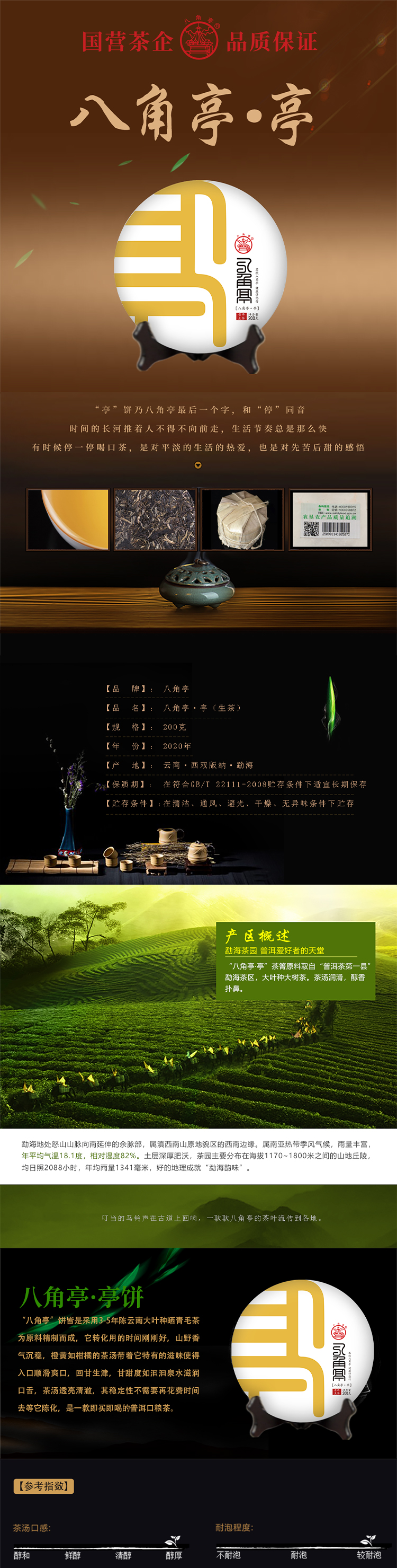 云墾茶業(yè)集團(tuán)下屬茶葉生產(chǎn)企業(yè)——云南農(nóng)墾集團(tuán)勐海八角亭茶業(yè)有限公司原名黎明茶廠,是我國歷史最為悠久的茶企之一,曾位列“中國普洱茶十大知名品牌”“十大最受歡迎茶葉品牌”、“中國普洱茶十大暢銷品牌”中,成為今天市場上最有影響力的品牌之一。公司產(chǎn)品獲得“綠色食品”、ISO9001、 HACCP和云茶品牌(YC)4項(xiàng)認(rèn)證,連續(xù)獲得“云南名牌農(nóng)產(chǎn)品”“云南名牌產(chǎn)品”“云南省著名商標(biāo)”等品牌榮譽(yù),公司生產(chǎn)的多款普洱茶在歷次專業(yè)評比中多次獲得特等金獎和金獎。在2018第五屆中國企業(yè)五星品牌論壇上,云南農(nóng)墾集團(tuán)勐海八角亭茶業(yè)有限公司上榜中國普洱茶行業(yè)影響力品牌——“金芽獎”,公司負(fù)責(zé)人陳勝軍先生獲“陸羽獎”,被授予2017“國際十大杰出茶人”榮譽(yù)稱號。