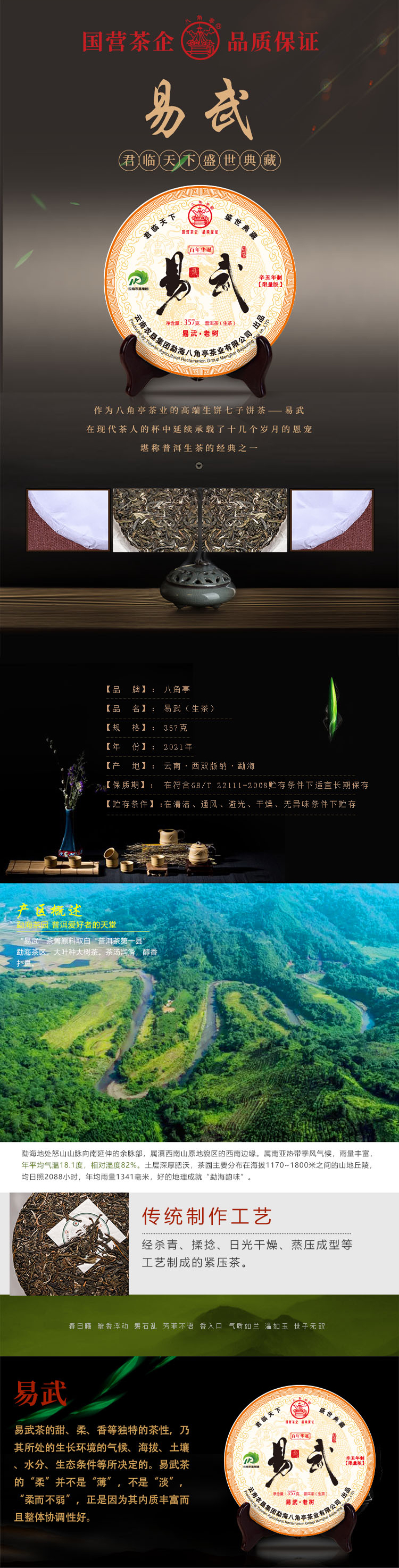云墾茶業(yè)集團(tuán)下屬茶葉生產(chǎn)企業(yè)——云南農(nóng)墾集團(tuán)勐海八角亭茶業(yè)有限公司原名黎明茶廠,是我國歷史最為悠久的茶企之一,曾位列“中國普洱茶十大知名品牌”“十大最受歡迎茶葉品牌”、“中國普洱茶十大暢銷品牌”中,成為今天市場上最有影響力的品牌之一。公司產(chǎn)品獲得“綠色食品”、ISO9001、 HACCP和云茶品牌(YC)4項(xiàng)認(rèn)證,連續(xù)獲得“云南名牌農(nóng)產(chǎn)品”“云南名牌產(chǎn)品”“云南省著名商標(biāo)”等品牌榮譽(yù),公司生產(chǎn)的多款普洱茶在歷次專業(yè)評比中多次獲得特等金獎(jiǎng)和金獎(jiǎng)。在2018第五屆中國企業(yè)五星品牌論壇上,云南農(nóng)墾集團(tuán)勐海八角亭茶業(yè)有限公司上榜中國普洱茶行業(yè)影響力品牌——“金芽獎(jiǎng)”,公司負(fù)責(zé)人陳勝軍先生獲“陸羽獎(jiǎng)”,被授予2017“國際十大杰出茶人”榮譽(yù)稱號。