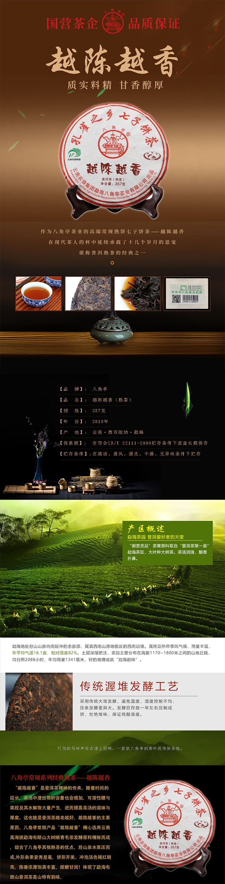 八角亭茶業原為黎明農工商聯合公司(黎明農場)下屬茶葉加工組,始于一九六四年,從事茶葉產品開發生產五十余載,一九八四年建成標準化工廠,二00一年開始生產普洱茶,截止到2013年,公司累計生產各種普洱茶數百個品種共12000余噸。