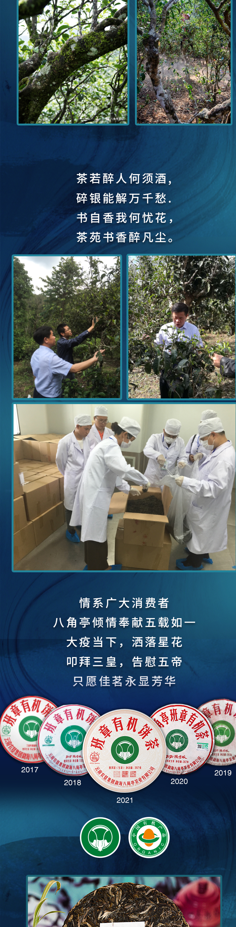 ??——八角亭茶業公司:經營方式為生產加工、銷售,主營普洱茶、緊壓茶、兼營毛茶收購。目前以生產、加工、銷售“八角亭”系列普洱茶為主,是云南省農業產業化龍頭企業。“八角亭”商標獲得云南省著名商標,“八角亭”牌普洱茶榮獲云南省名牌產品和云南省名牌農產品。已先后通過工業生產許可證、ISQ9001與HCCP認證、云茶牌認證(YC)等項工作,在歷次專業評比中“八角亭”普洱茶多次獲得特等金獎和金獎。2017年5月,“八角亭”牌老班章茶葉獲得了有機茶資格認證。八角亭茶業公司多次進行了技術改造,現已建立了標準化生產車間和設備,年設計生產量達3000噸,是整個公司的主體核心企業。