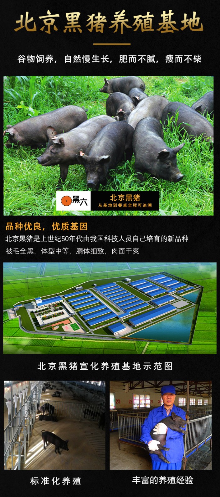 自公司成立以來,黑六團隊秉承“黑六”文化精髓,以飼養北京黑豬、弘揚民族品牌,滿足市場對差異化、特色安全優質豬肉的需求為企業使命,通過地方優良豬種飼養模式和“黑六”品牌建設的創新,展現了北京黑豬的卓越品質和風采,成為我國地方豬種和地方培育品種科學保護、有效開發、成功利用的典范。