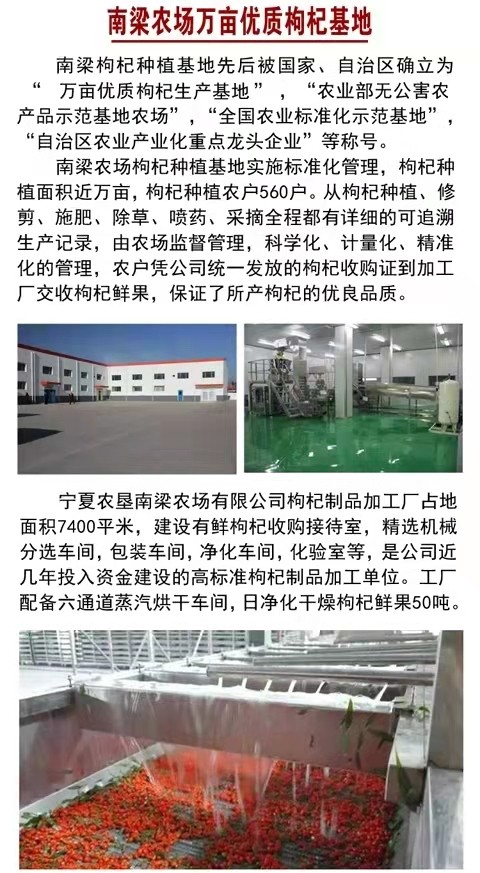 寧夏農墾南梁農場有限公司【原寧夏枸杞企業(集團)公司】成立于1992年8月,位于銀川市西夏區南梁農場,是寧夏農墾集團有限公司所屬的枸杞種植、加工、銷售為一體的專業化公司。已有50多年的枸杞栽培歷史,所產枸杞素以粒大、肉厚、籽少、味甜、藥效高而居寧夏枸杞之冠。